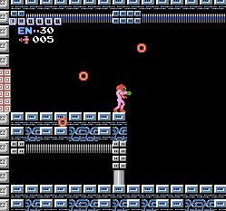The first few rooms of Tourian are pretty self explanatory. Just keep moving slowly, killing Metroids as you go. The little red rings are called Rinkas. They do a fair bit of damage. Try to avoid them. |